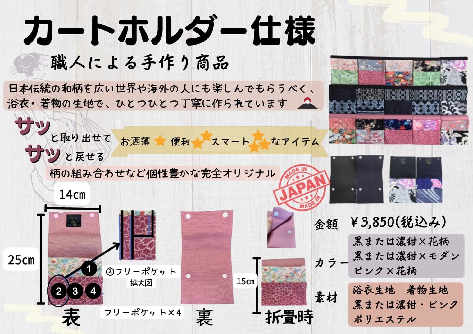 お色、デザインお任せ! 職人による手作り商品になりますので同じ柄は御座いません。すべての柄が異なるのも魅力的です。 着物の生地をリメイクして作りましたのでしっかりしております。 お友達へのプレゼントとしても喜ばれております。 ※大きさや詳細は画像をご覧くださいませ。 メーカー小売価格3,850円 税込